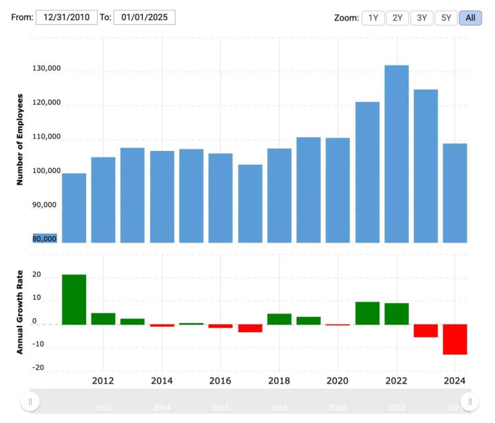 这表明,英特尔在陈立武上任后解雇了 20500 名员工。